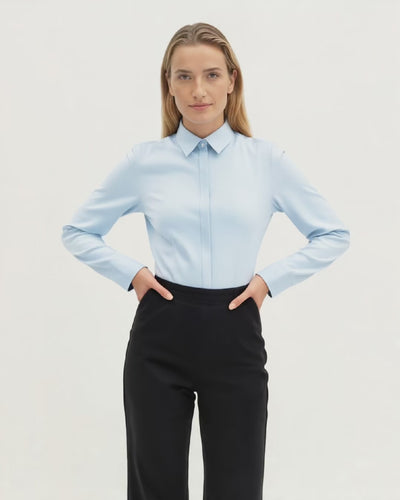 Meet the Slim Fit Blouse. Designed for modern movement, this blouse delivers an all-day polished look, with 4-way stretch and a flattering silhouette that holds its shape. It's crafted from 100% recycled polyester and features advanced non-iron & non-transparent fabric, and repels odours, spills and wrinkles so you can skip the steamer and the layering.