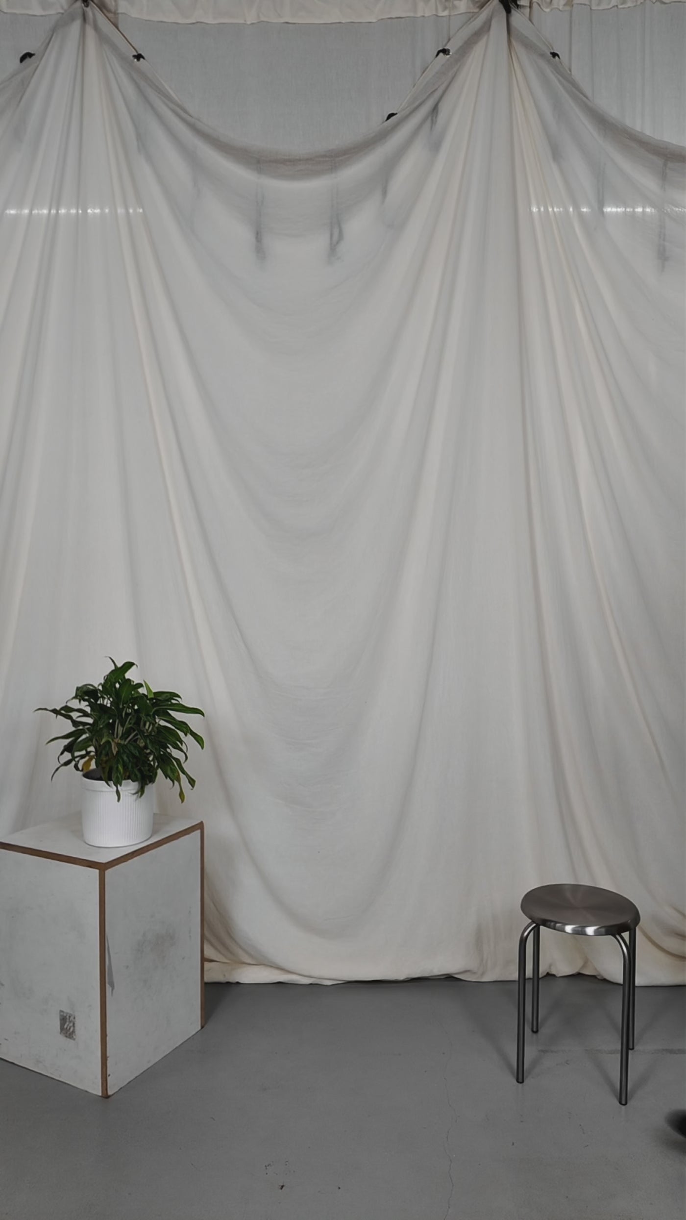 Two people sitting on a stool in a studio setting with photography equipment.