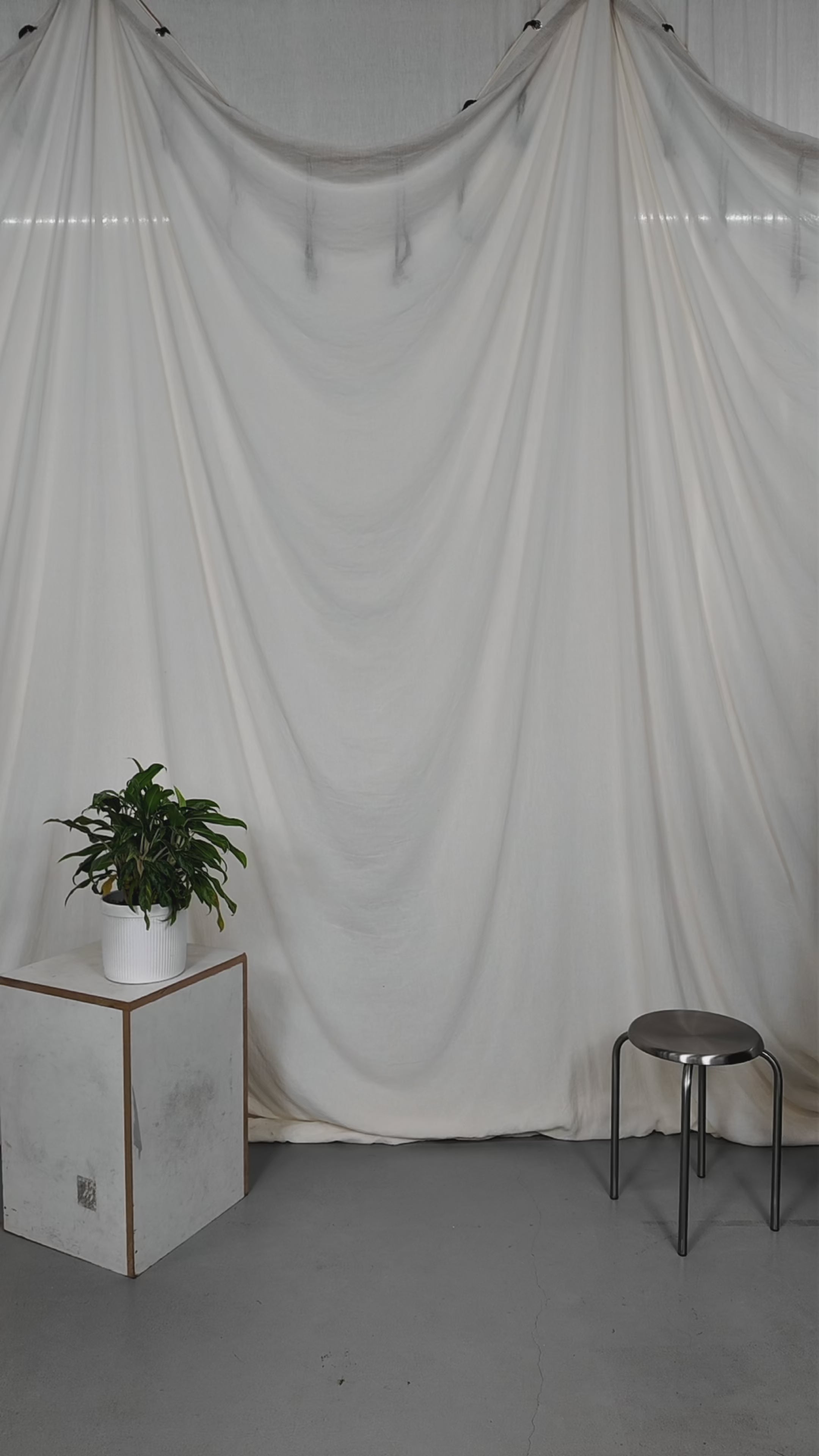 Two people sitting on a stool in a studio setting with photography equipment.